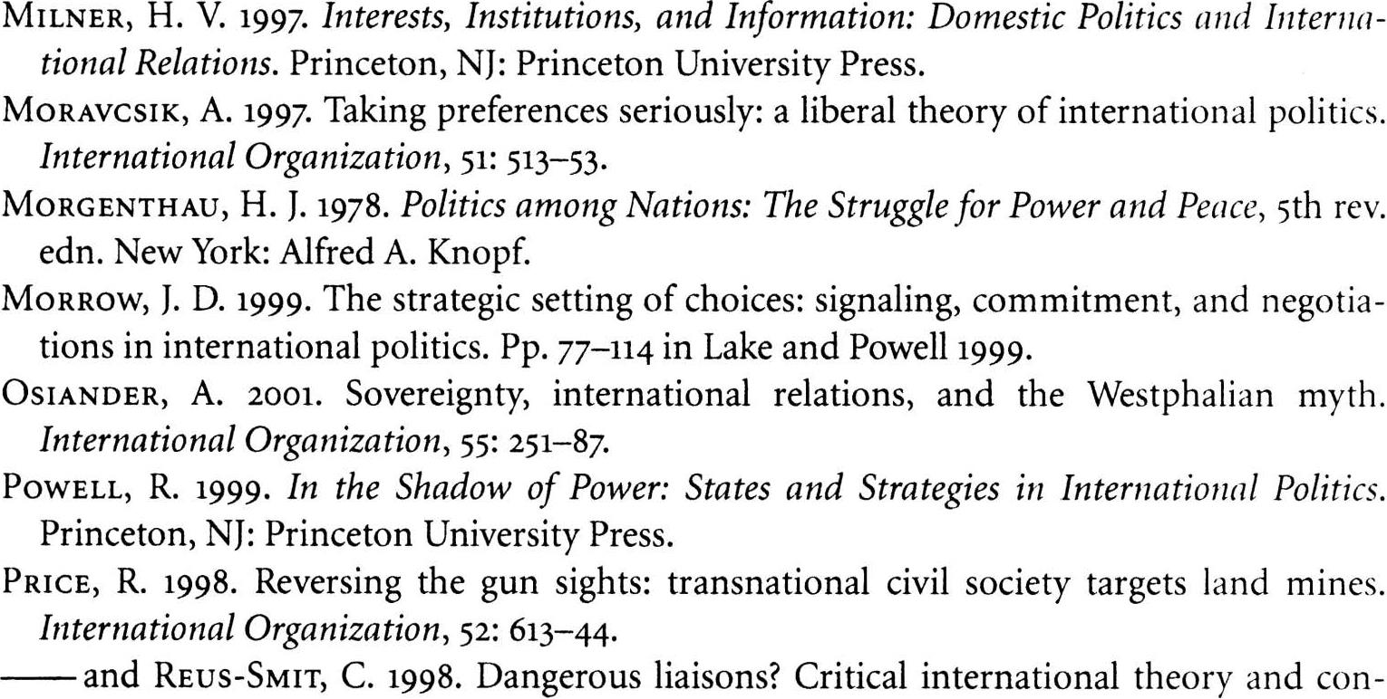 在后者中,国家之所以被假定是分析单位,并非因为像国家利益基本原理中所说国家生来如此,而是因为理论家们希望借国家这一分析单位在自己所研究的问题上获得某些解释性成果。或许因为经济政策具有更为明显的再分配效应,国际政治经济学家们倾向于强调国内政治的重要性,他们认为加深对政策偏好的理解才能实施更多的解释性“行动”,国际安全学者们则倾向于更加重视各国之间的战略互动,因为对于和平和战争来说,讨价还价、信息和可信承诺看起来更加关键(Fearon 1995; Powell 1999)。但是,像所有理论一样,这些只是我们在将一片原本黑暗之地置于聚光灯下,认为最有可能在某处获得一些有意义的且可能非常重要的见解时,在方法论方面的赌注。如此,即使我们接受了国家利益很少存在这一批评的有效性,国家中心主义理论可能仍然十分有用。当各国之间的战略互动对于了解国家偏好如何转化成国际政治后果非常重要时,情况尤其如此。
