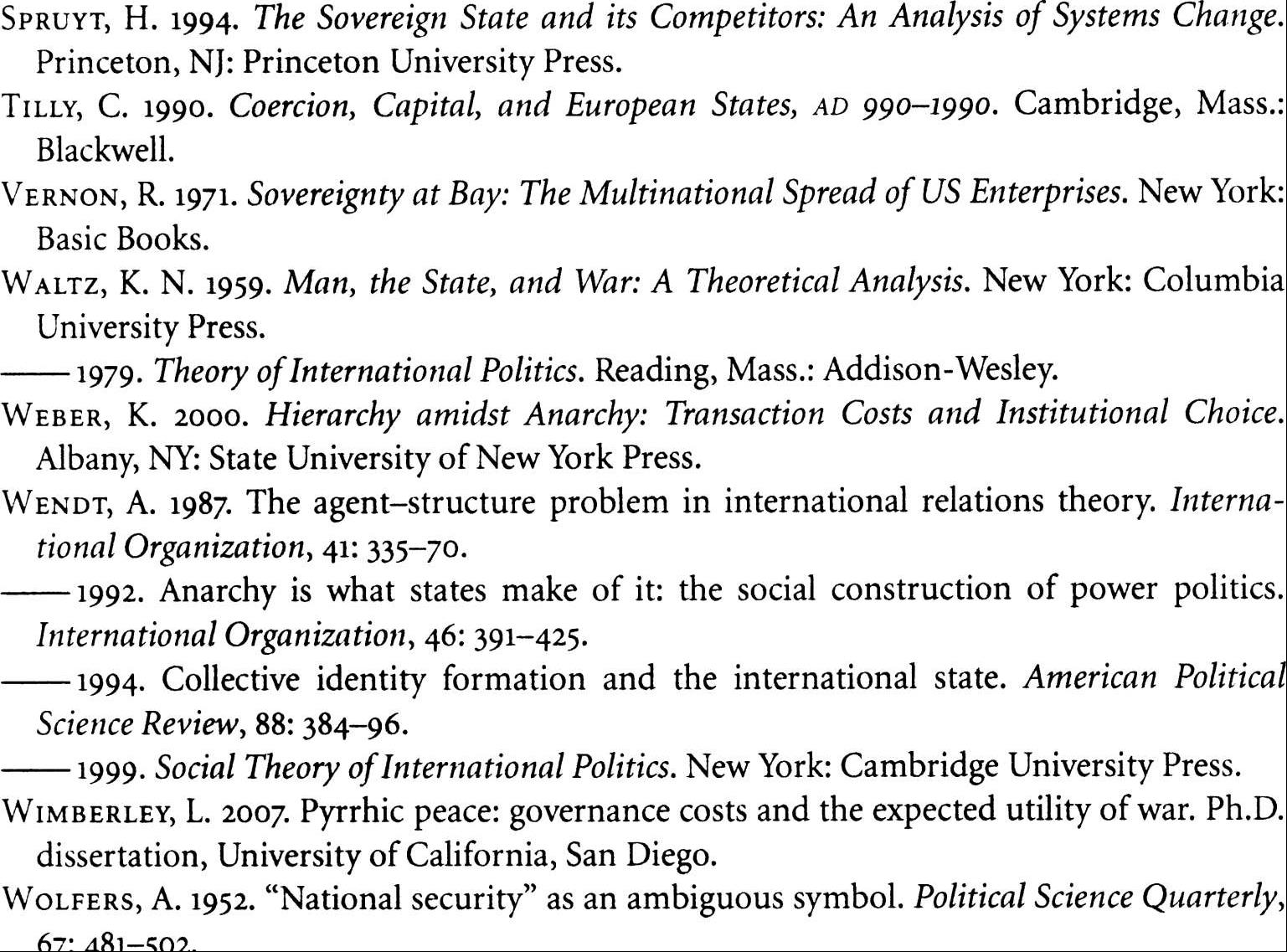 今天,具有领土主权的国家从很多方面来说就像一个谜,或者说最多算是另一个便于分析的虚构之物。然而,它在国际关系理论中仍有持续影响。20世纪的大趋势在继续对各政治单位进行塑造和重塑。不过,如果各国并非在所有方面都相似且不符合具有领土主权的国家模型,我们就还是缺少一组可以用以排列不同政体类型的通用维度。同样地,我们也缺少可以用来解释变化,更重要的是能够以清晰、可测试、可检验的方法串联不同单位的异质性的理论。如果认真对待世界政治史,我们就可能怀疑不同类型的单位会对国际关系造成深远影响,例如,我们可能会怀疑19世纪的帝国主义世界在某种程度上与20世纪晚期的多民族国家世界确有不同,只是我们没有对这一直觉进行深入探究的工具可用。如果我们打算对我们在当今世界所面临的这一政治组织的转换形式进行阐释,我们确实需要更加关注这一领域。