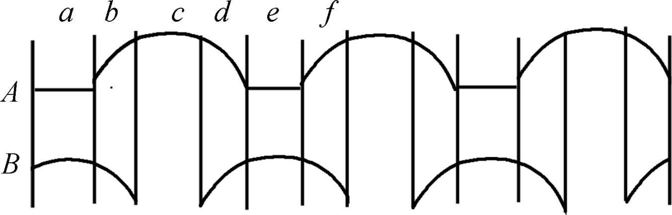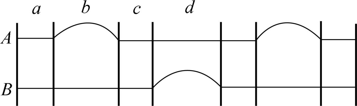人步行时的双脚动作如图2-5所示,上面的 A 线表示一只脚的动作,下面的 B 线表示另一只脚的动作。直线表示脚接触地面的时间,曲线表示脚离开地面的时间。从图上我们知道,在 a 时间段里,双脚接触地面;在 b 时间段里, A 脚在空中, B 脚接触地面;在 c 时间段里,双脚同时接触地面。步行的速度越快, a 、 c 两段时间越短(请与图2-6进行比较)。