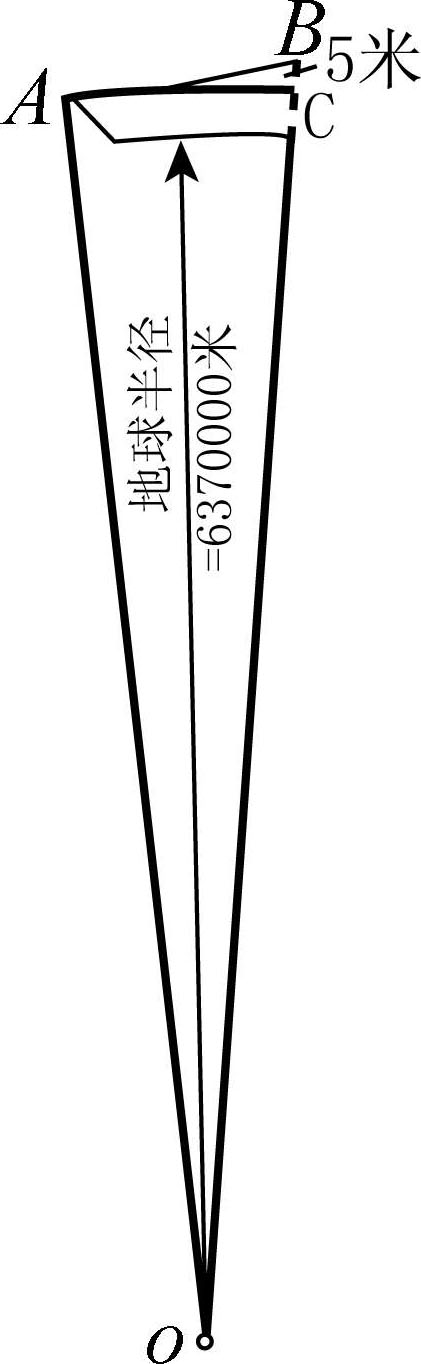 那是不是有可能使炮弹的飞行路线曲率小于地球表面的曲率呢?首先它必须具备同样的速度。图2-11是地球一部分的剖面图,假设我们在山上的 A 点放置一门大炮,在不存在万有引力的情况下,炮弹水平射出1秒它就可以到达目的地 B 点。然而事实上,一秒钟后它仅仅能到达低于 B 点5米的 C 点处。我们假设我们的炮弹下落5米后恰好是它应该到达的高度,也就是说是没有引力的情况下到达的地方。