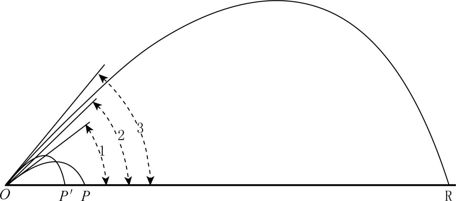 炮弹的飞行距离随着大炮射角的改变而改变。射角为1时,炮弹落在 p 处;射角为2时,炮弹落在 p′ 处;射角为3时,射程会加大很多倍,因为炮弹已经钻到空气稀薄的平流层里了。
