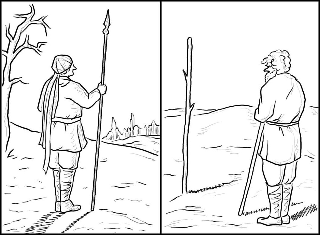 图1-3 根据太阳的高低(左)和影子的长短(右)来判断时间