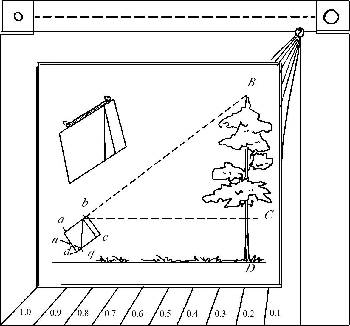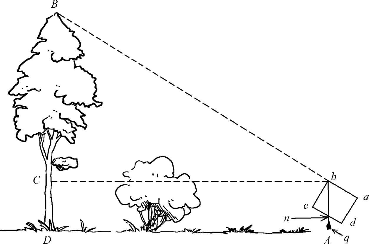 图1-11解释了测高仪的使用原理。测量的时候,测量的人拿着这个由硬纸板或者木板所做成、标有 abcd 位置的方板时,向 ab 边方向望去,通过调整仪器的倾斜角度,使树梢 B 与 ab 边在同一直线上。此时在 b 点系一根细绳,下端系一小重物 q 。在垂直的细绳于 dc 线的交叉处形成 n 点。由于三角形 bBC 与 bnc 都是直角三角形,且由于锐角 bBC 与角 bnc 相等,因此两个三角形相似,我们可以知道: