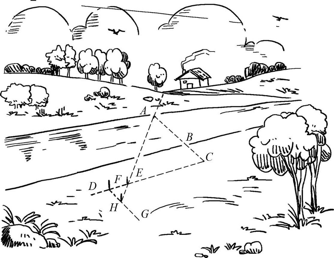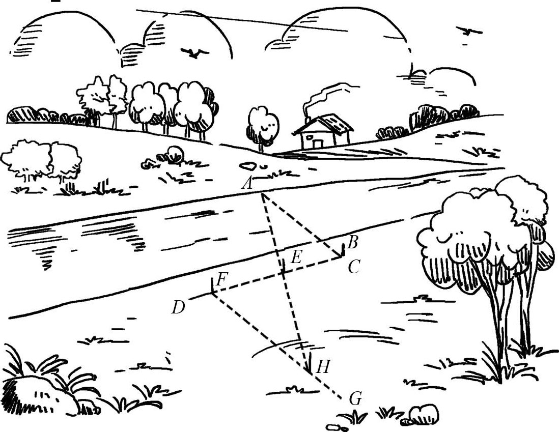 FH 的长度等于 AC 的长度,因此,只要从 FH 中减去 BC 就可以得出所求的河流宽度 AB ,至于 FH 为什么等于 AC ,读者自己就可以很容易证明出来。