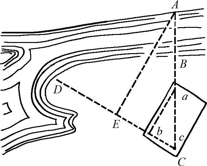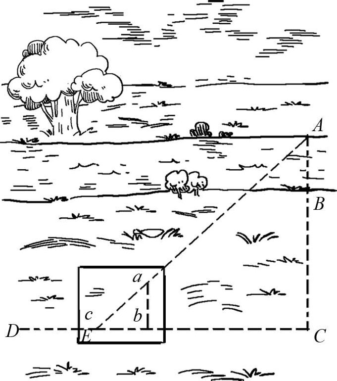 (2)第二种方法。这里我们将采用“大头针测量仪”的方法,这种方法所需要的仪器很容易做出来。就是找三个大头针,按照图2-3的样子将等腰直角三角形的三个顶点钉好。在我们不打算摆渡到河对岸的情况下, AB 是我们所需要测量的河流宽度(图2-4),这时候我们站在点 B 这个河岸岸边,站在点 C 旁边,将大头针仪放在眼前,眼睛顺着大头针的方向望去,两枚大头针 a 、 b 可以将 A 、 B 两点完全挡住。这时候我们就站在 AB 的延长线上,这样保持仪器不动, b 、 c 两个大头针的方向与刚才的方向是垂直的,沿着这两枚大头针望去,就会发现被大头针挡住的 D 点,也就是说, D 点是在与 AC 垂直的这条直线上的,这时候将一根木桩钉在 C 点,然后沿着 CD 一直向前走,如图2-5所示,找到一点 E ,在这里,同时可以看到 A 点被大头针 a 挡住,那也就是说这里是这个三角形的第三个顶点,角 C 为直角,角 E 是45 ° ,角 A 也是45 ° ,所以 AC = CE ,这时候测量了 CE 的距离就会间接知道 AC 的距离, BC 的距离也很容易得到,这样也就能够求出河流的宽度了。不过在使用大头针仪的时候也要注意使它保持不动,最好的方法就是将带有仪器的木板固定在木杆上,再将这根木杆插进地里,这样就可以固定在地上了。