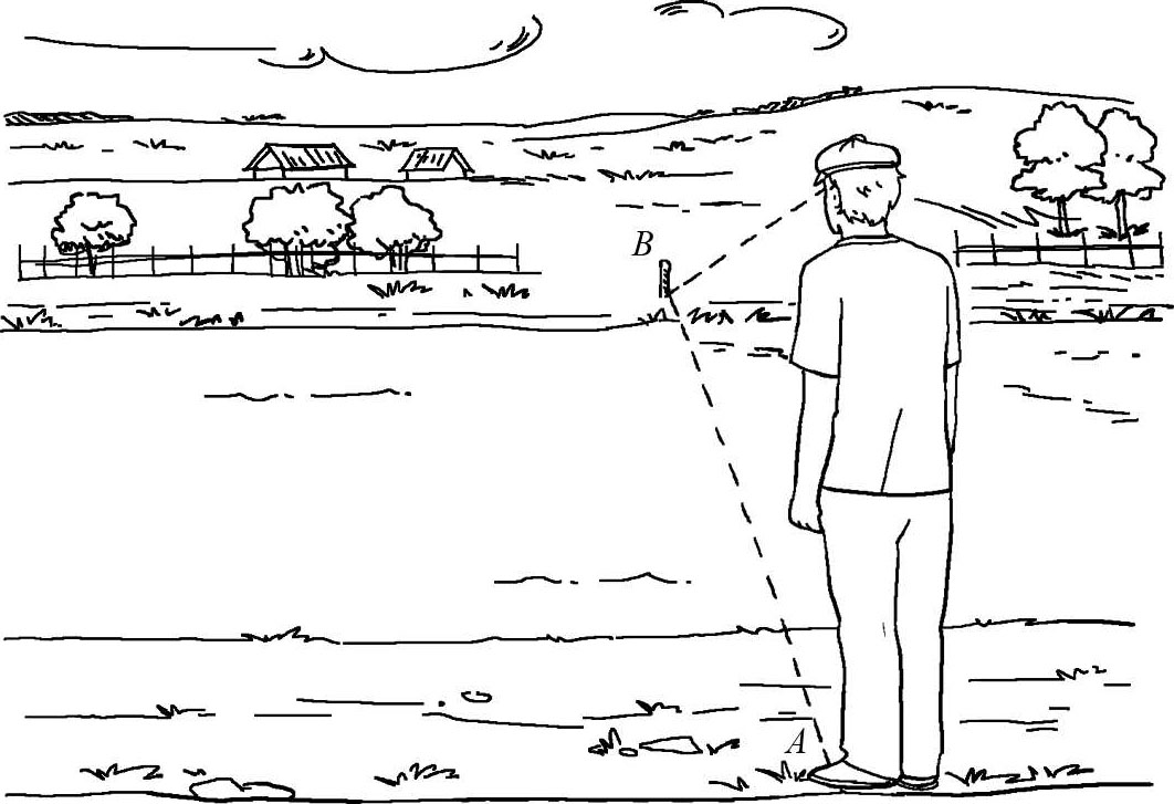 为了检验结果是否准确,库普里扬诺夫决定借助“帽檐”来检验这名侦察兵的目测结果,以测得更加精确的河流宽度。这个方法可以用一顶帽子来实现,将帽子戴在头上,使得帽子的帽檐正好在眼睛的上方,然后面对着河水站在岸边,朝着河水望过去。这个时候,帽檐的底边是和对面的河岸线重合的,如图2-8所示,观察者转动身体,从帽檐下可以找到一个最远的点,这个点可能是在观察者的左边或者右边,甚至是观察者的后面,从那个点到观察者之间的距离也就是这条河的大概宽度,如果没有帽子也可以换成是笔记本或者就用手也可以完成,只要将它们放在额头前就可以代替帽檐了。当然在选择地点的时候最好选择平坦的地面,这样有利于你进行观察。库普里扬诺夫就是用了这种方法,只见他从灌木丛中站起来,迅速地将笔记本贴在额头上,然后快速转身找到了最远的那一点,最后他带领一个侦察员爬到那个点,用绳子测量出距离为105米。