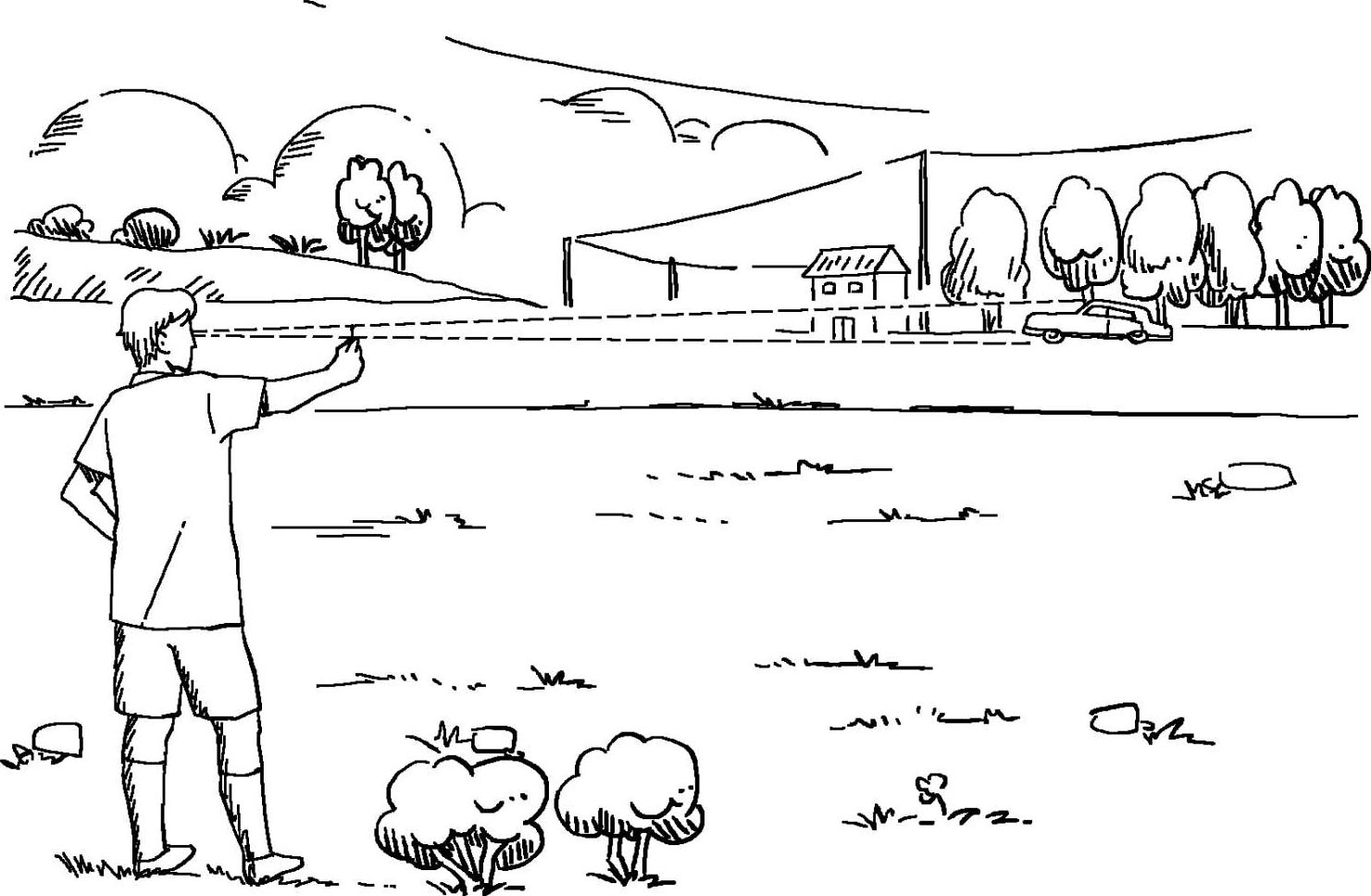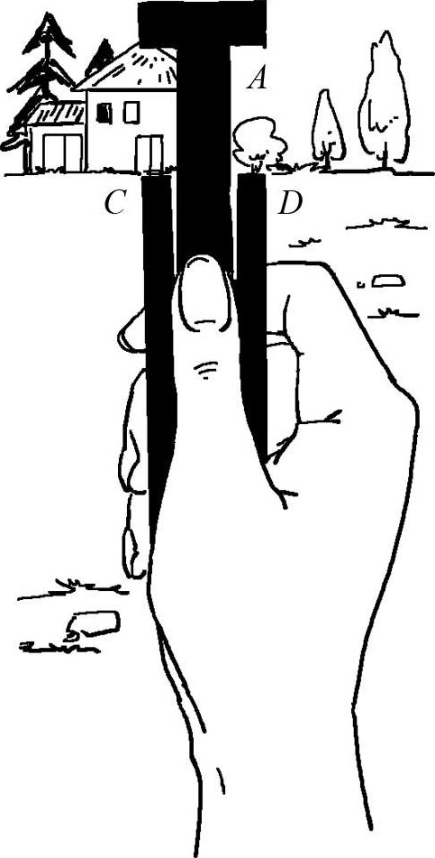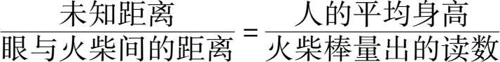 如果你想测出自己与远处某个人之间的距离,这时候火柴测远仪就可以帮助你得到这个结果了。将火柴拿在手中,手臂伸直,然后用一只眼睛望向远方的人,使得火柴的顶端和那个人的头顶恰好重合,这时候我们缓慢地移动我们的大拇指,在火柴上下移动,停在正好挡住那个人脚底的地方,然后把火柴拿到眼前,数一下指甲所占的格数,这样数据就测量好了(图2-15)。