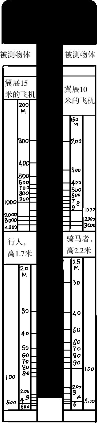 图2-13所示是用这种推动式的测远仪测过一些物体后的状态,为了避免一些计算,干脆将事先算出来的距离直接在 C 板上标记出来,在 D 板上写上测量骑马的人的距离,对电线杆和测量翼展为15米的飞机与人的距离和类似庞大的物体与人的距离,也在 C 和 D 两个板的空白地方记录下来,以便后期使用。