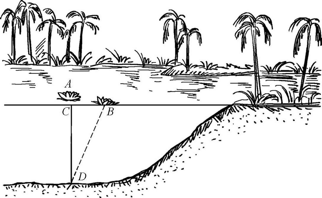 [ 解 ]我们探讨了水面上的圆圈,又探讨了炮弹的问题,现在又来到了水上。这道印度人提出的荷花小诗中的问题并不难解答,如果你在河岸边或不深的水塘边,水生植物到处都可以找到,无须任何工具,手都不会被沾湿,利用水生植物就可以提供你解答问题的数据,从而得出水的深度。
