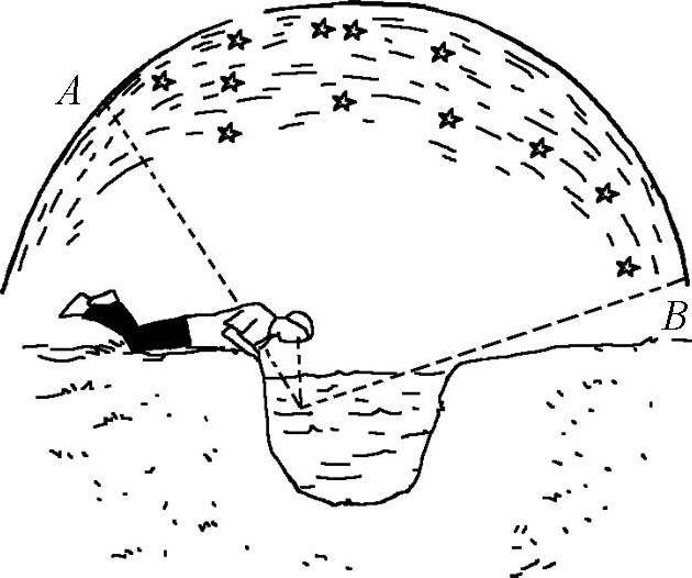 换一个场景,如果你来到一个水面比较狭窄,河岸又低矮的地方,俯下身来,你将看到的星空会比刚才在大河上看到的大很多,几乎可以看到一半的星空,如图2-29所示,只要调整好你与河面所成的视角,那么就很容易证明宽广的大河看到的星空反而比小河看到要小很多,的确令人惊奇。这样看来,开头果戈理描写的第聂伯河水面所倒映的星光确实有些夸大,其实我们所能看到的星星远不是所有的,不管怎样看,我们甚至连星空的一半都看不到。