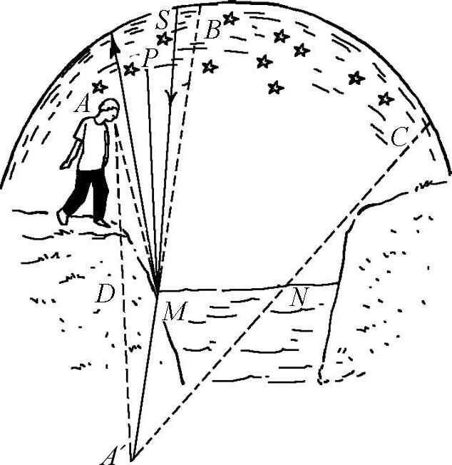 为了更好地回答这个问题,我们不妨从点 A 出发向 MN 作一条垂线 AD ,并将垂线延长至点 A′ ,且与 AD 的距离相等。如果观测者的眼睛处在点 A 的位置,从点 A 观望星空的实际观测者的视野只能是 BA′C 角度以内那部分星空。由于观测者的眼睛无法捕捉到这些星光反射的光线,所以他没有办法看到这一角度以外的星星。