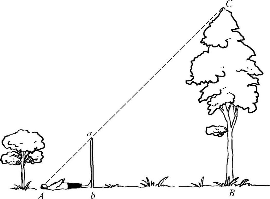 如果制作仪器对你来说有点麻烦,下面还有一种更简单的方法。不用制作仪器,你只要找到一根长木杆,把它垂直插入地里,使其露在地面上的高度等于你的身高。但是你需要选择这样一个插杆地点,如图1-6所示,当你面朝上躺在地上时,应该可以看到树顶和木杆顶端在同一直线上。因为这时三角形 Aba 是等腰直角三角形,所以通过测量 AB 就可得到所求的树高了。