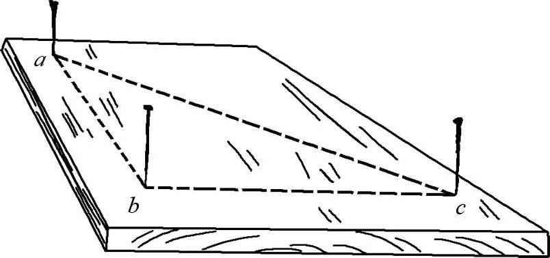第一种方法是自制简易测量仪。需要的材料有:一块一面光滑的木板,一张纸,一支笔,三枚大头针,一个小重物。这些材料十分简单,即使是野营时都不难找到。找齐材料以后,需要在木板光滑的一面上画一个等腰直角三角形。这时如果你身边并没有能画出直角的三角板或者可以画出等边的圆规,你可以把纸片对折两次,从而得到一个直角,再利用这张得到的纸三角量出相等距离。总之,开动你灵活的脑筋,办法总是多种多样的。当等腰直角三角形画好以后,就把三枚大头针分别钉在三角形的三个顶点上,测量仪的制作就算完成了(图1-4)。
