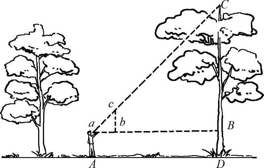 需要注意的是,应该在离被测树木有一定距离的地方,手持仪器,在 a 点上绑一根下端系有小重物的细线,使得三角形的直角边 ab 始终与地面平行。然后,人靠近或者远离树,通过移动找出点 A (图1-5),使得当从点 A 经 a 和 c 朝树顶 C 方向望去时,刚好无法看到树顶 C 。这意味着此时直角三角形的斜边(也称作弦) ac 的延长线通过了点 C 。即 a 、 B 、 C 构成直角三角形,而∠ a =45 ° ,所以 aB = BC 。