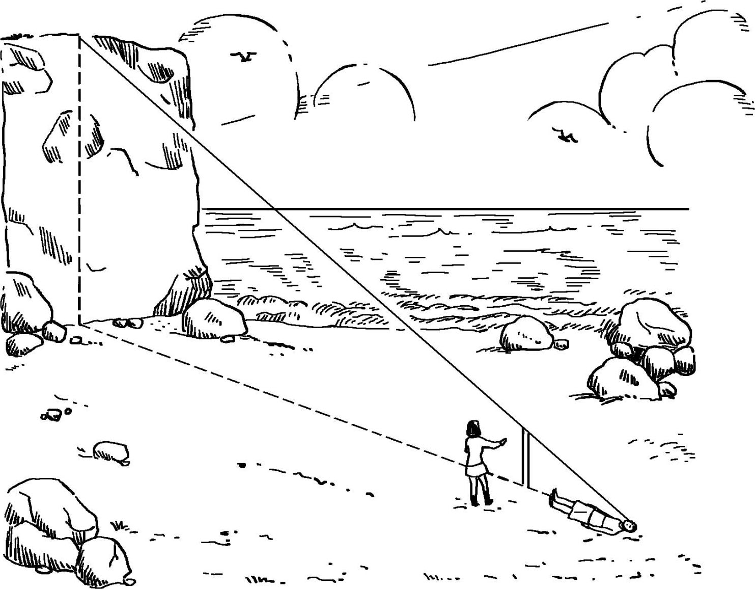 接着,他在离木杆有一段距离的沙地上躺下,眼睛正好可以看到木杆的顶端以及峭壁的边缘在同一直线上(图1-7)。在躺下的地方他仔细用木橛做了一个记号。