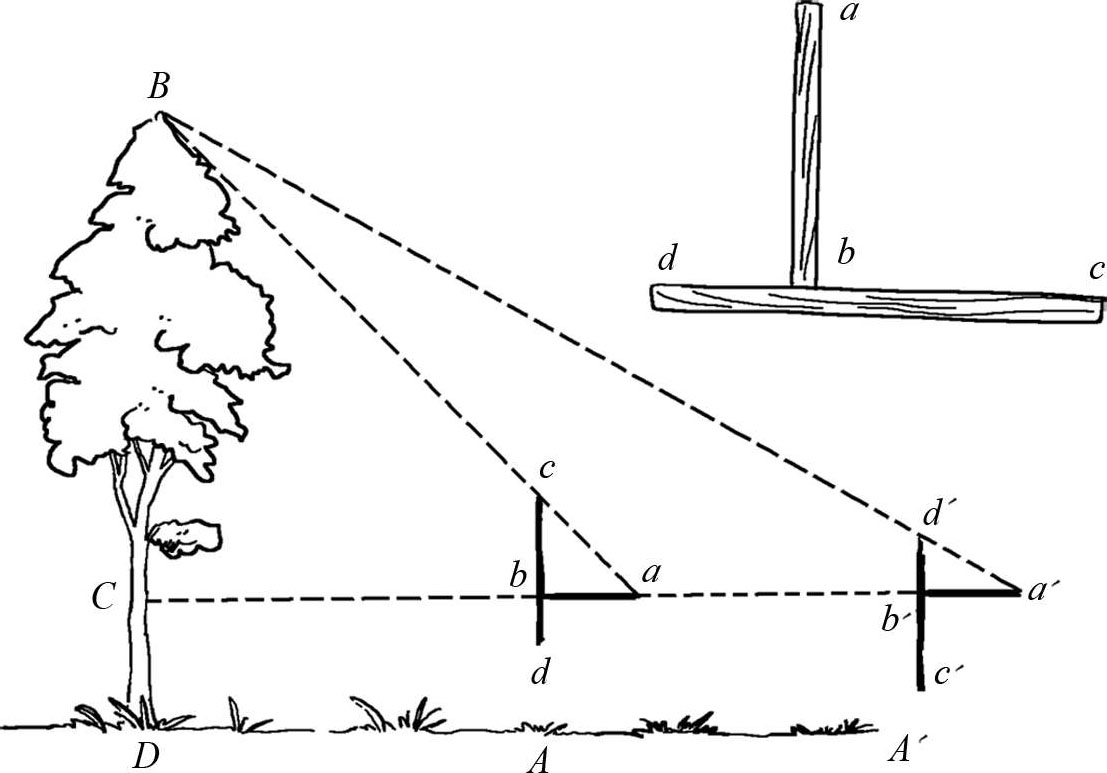 测量时,先利用悬锤调整好木条 cd 的垂直度,然后先后在两个地方进行测量(图1-10)。从点 A 开始时,应把仪器的 c 端朝上,测完后,应在距离点 A 有一定距离的点 A′ 处测量,此时应把仪器的 d 端朝上。注意选择点 A 时应使从点 a 朝 c 端望去时,可见其与树梢 B 在同一直线上。同理可以这样选择点 A′ ,当从 a′ 点向 d′ 望去时,可看到 d′ 与 B 重叠。测量工作的关键在于找到点 A 和 A′ 这两个点,因为被测树高的一部分 BC 等于距离 AA′ 。从下列算式可以很容易地弄明白 BC 与 AA′ 的相等关系: