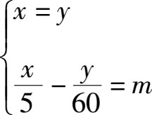 [ 解 ]我们知道,时针和分针重合的时候可以对调位置,而且对调之后所指示的时间也没有变化。所以我们还可以使用解上面那个题目时所推导出来的联立方程。只是由于时针和分针重合的时候,它们从12开始走过了同样个数的刻度,也就是说, x 的值和 y 的值是相等的。根据对前面问题的分析,我们就可以建立这样的方程组: