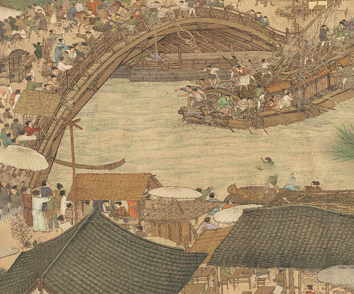 古德信正要答言,虹桥那边忽然传来一阵叫嚷,声气似乎很紧急,他不由得站起身,探出半截身子向虹桥那边望去,见桥上许多人都趴在桥栏上,全都望着桥下一只客船,纷纷挥臂叫嚷。再看那只客船,正要穿过虹桥,桅杆却高过桥梁大半截,眼看就要撞到桥梁。古德信心里一惊,忍不住说了声:“不好!”