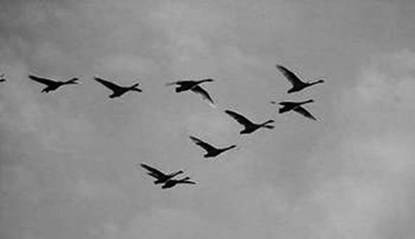 主持人:请大家观看这样一组画面(投影仪在屏幕上显示出一群雁在天空中排成人字形飞翔和一只孤雁无助地在天空中飞翔),然后思考图片中的含义。请同学们交流讨论,自由发言。