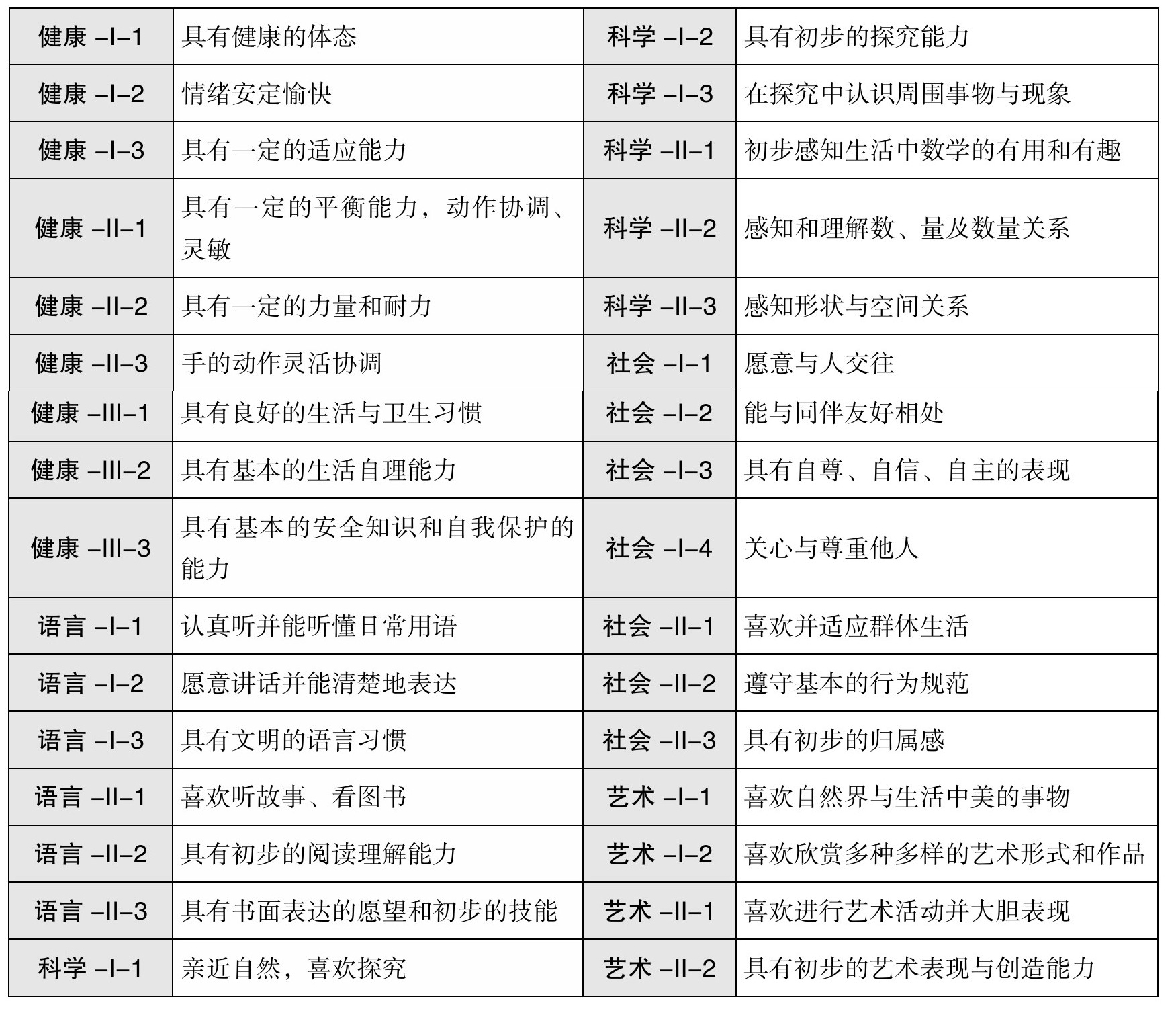 本课程以国家发布的《3—6岁儿童学习与发展指南》中的目标为课程目标。《〈3—6岁儿童学习与发展指南〉解读》(李季湄,冯晓霞,2013)包含了五个目标领域,即“健康”“语言”“社会”“科学”“艺术”。每个领域都有子领域和具体的目标。