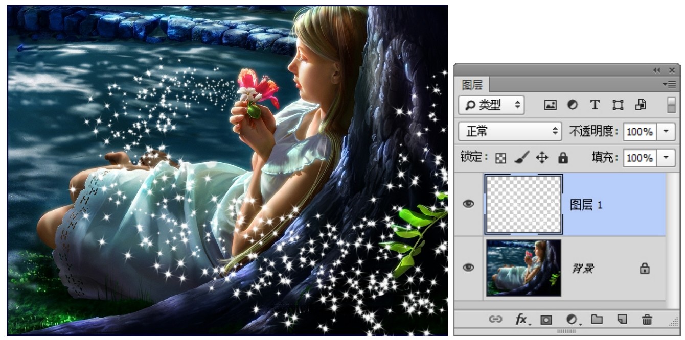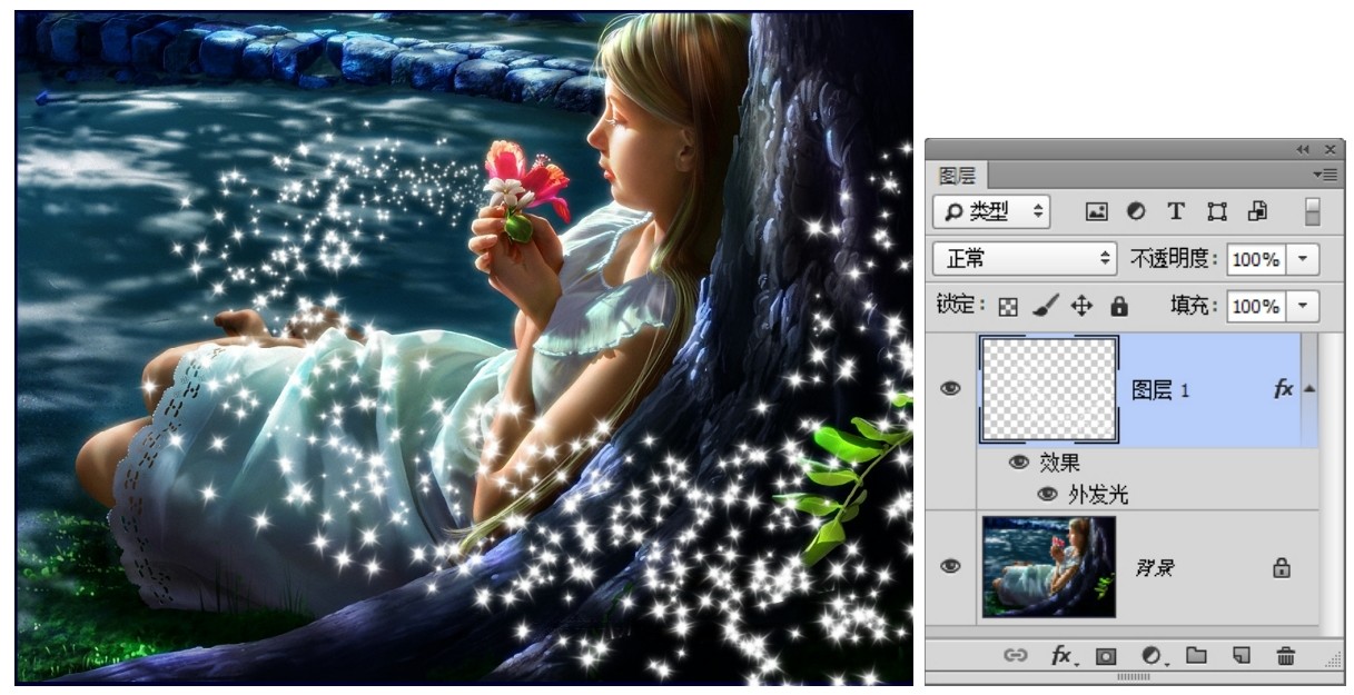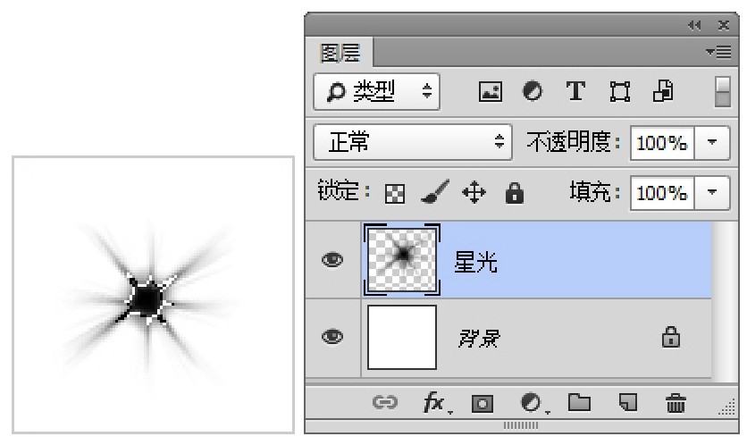 (1)打开图像“第2章素材\星光素材.psd”。按住Ctrl键,在【图层】面板上单击“星光”层的缩览图以载入“星光”的选区,如图2.37所示。