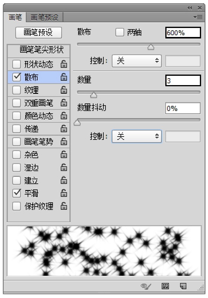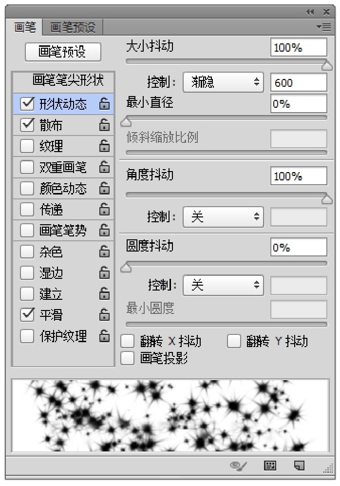 (4)打开【画笔】面板,设置【散布】参数如图2.39所示,设置【形状动态】参数如图2.40所示(【渐隐】参数可控制笔画的长度,单位为像素,取值越大,笔画越长,此处设置为600。在实际操作中,若产生的笔画长度不合适,可调整此参数的值)。