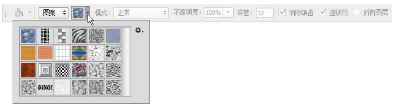 (9)选择油漆桶工具,在选项栏上将【填充类型】设为“图案”,并从右侧图案选取器的底部选择上述自定义的图案。