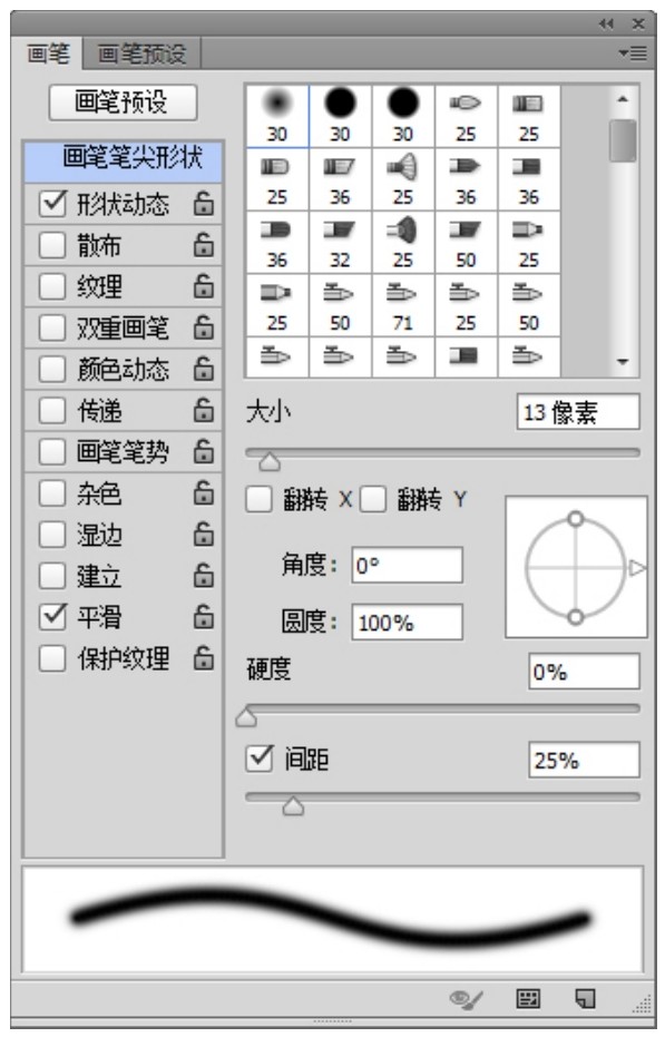 (1)【画笔】:用于设置画笔笔尖的大小、硬度、间距、角度、圆度等参数。
