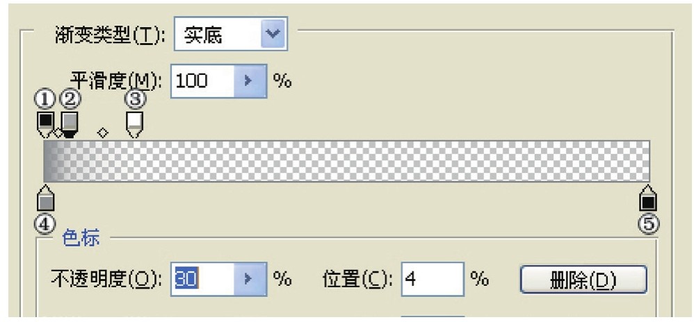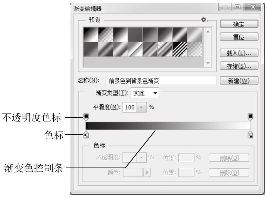 (5)选择渐变工具。打开渐变编辑器,在【预设】栏选择“前景色到透明渐变”,并以此为模板在“渐变色控制条”上定义如图2.97所示的渐变。