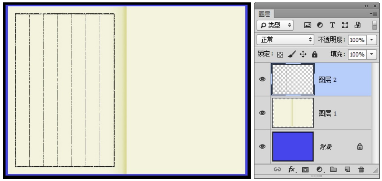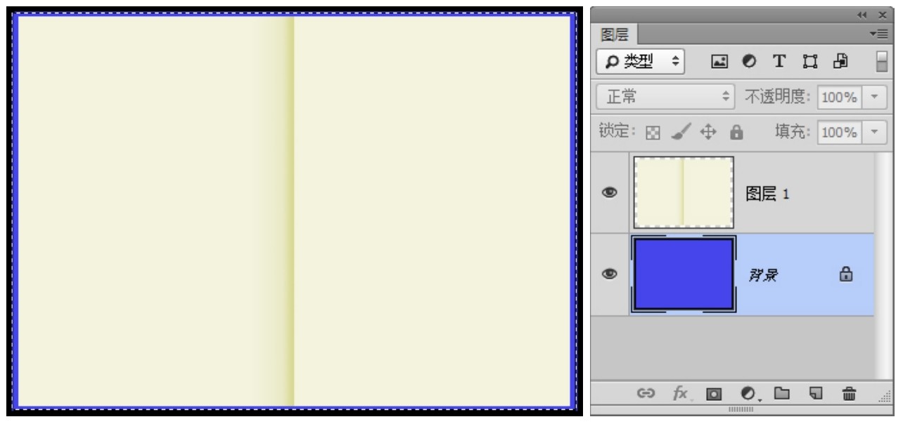 (8)创建如图2.100所示的矩形选区。在背景层的选区内填充蓝色(# 4545eb),形成书的封面,取消选区。