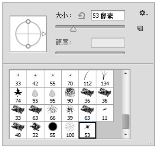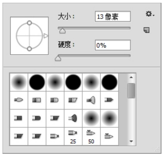 :单击该按钮可打开画笔预设选取器(图2.35),从中选择预设的画笔,并可更改预设画笔笔尖的大小和硬度。