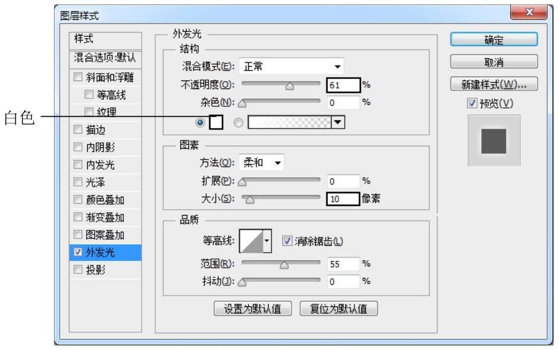 (7)选择菜单命令【图层】|【图层样式】|【外发光】,打开【图层样式】对话框,【外发光】参数设置如图2.43所示。