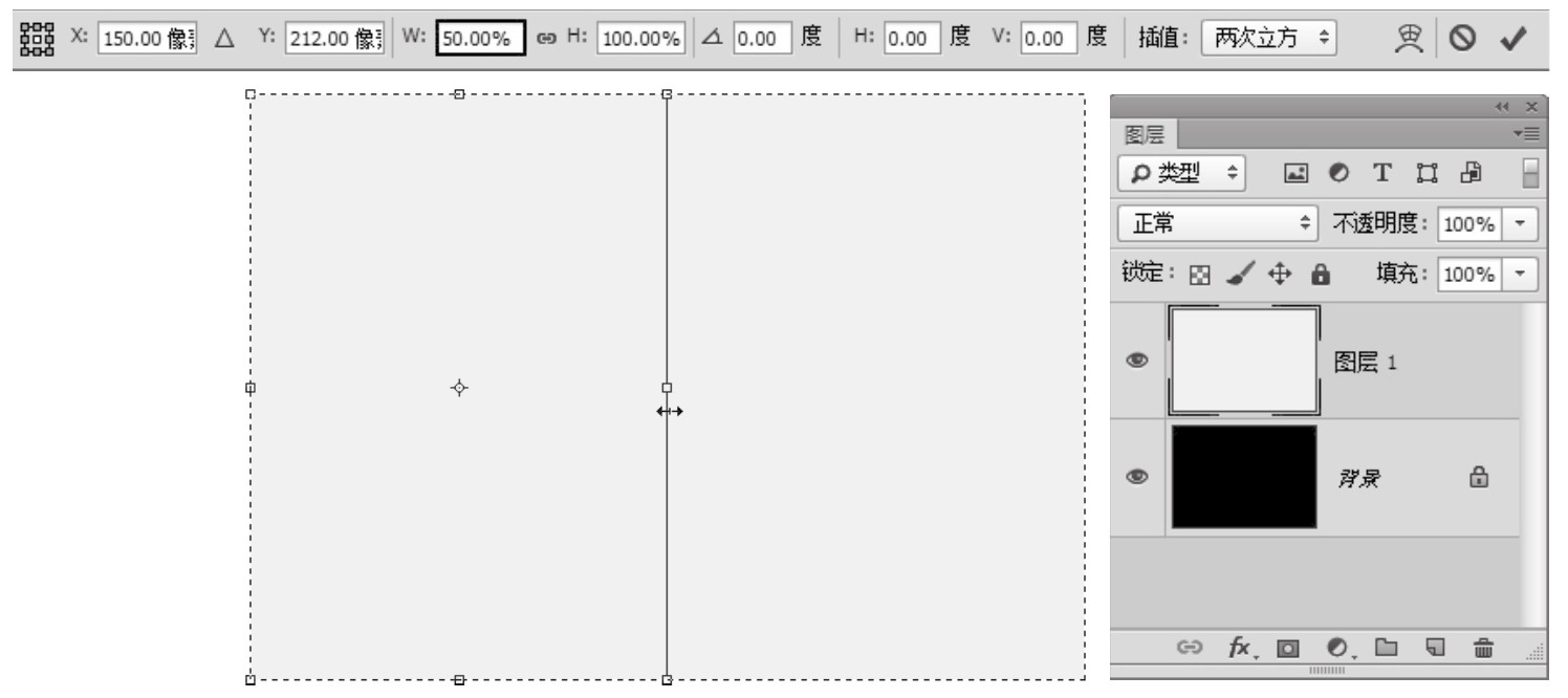 (4)选择菜单命令【选择】|【变换选区】,显示变换选区控制框。将右边界中间控制块向左拖动,同时观察选项栏,直到选区宽度变为原来的50%,如图2.96所示,按Enter键确认。