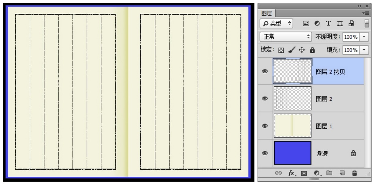 (10)确保选中图层2。选择移动工具,按住Alt键,在图像窗口中向右拖动光标复制黑色方格线,放置到如图2.102所示的位置。