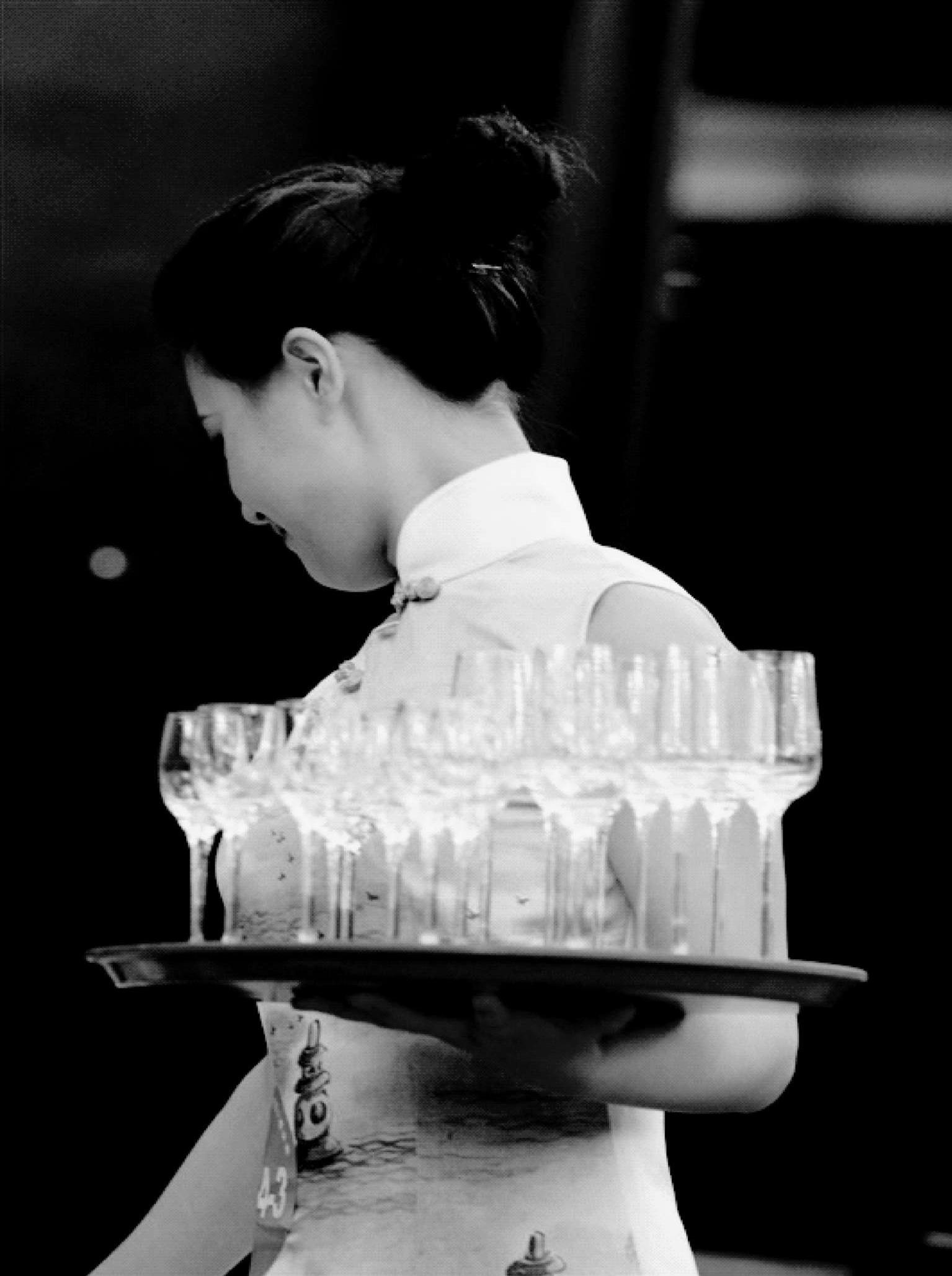 (6) 托盘不能越过宾客头顶,随时注意数量、重量、重心的变化,手指做出相应的移动。