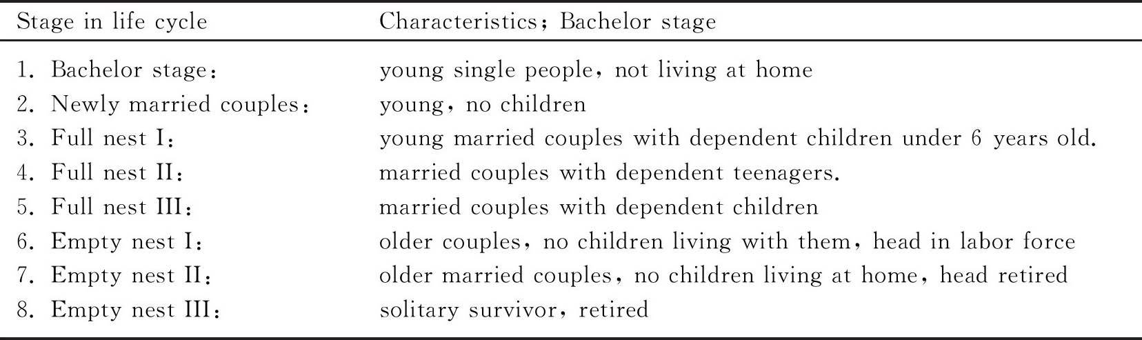 Source:William D.Wells and George Gubar,“Life Cycle Concept in Marketing Research,”Journal of Marketing Research,November 1986,pp.355-363 J.Paul Peter and Jerry C.Olson,Consumer Behavior:Marketing Strategy Perspective(Homewood,Illinois,Richard D.Irwin).p.459
