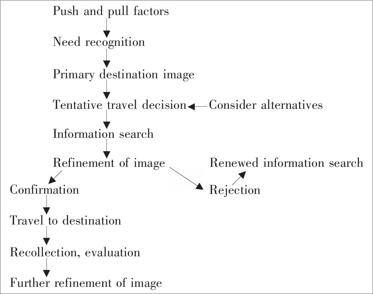 In general,the consumer’s buying process involves six distinct stages:need recognition,information search,evaluation of alternatives,purchase decision,actual purchase and post-purchase behavior,including consumption.However,the tourist’ buying process is not a simple linear progression.It usually involves several feedback loops that can result in a return to earlier stages.Figure 3.1 is an example of a destination buying process that accommodates such complexity.In this particular model,push and pull factors provide the consumer with the incentive or predisposition to travel,thereby shaping his or her need recognition.