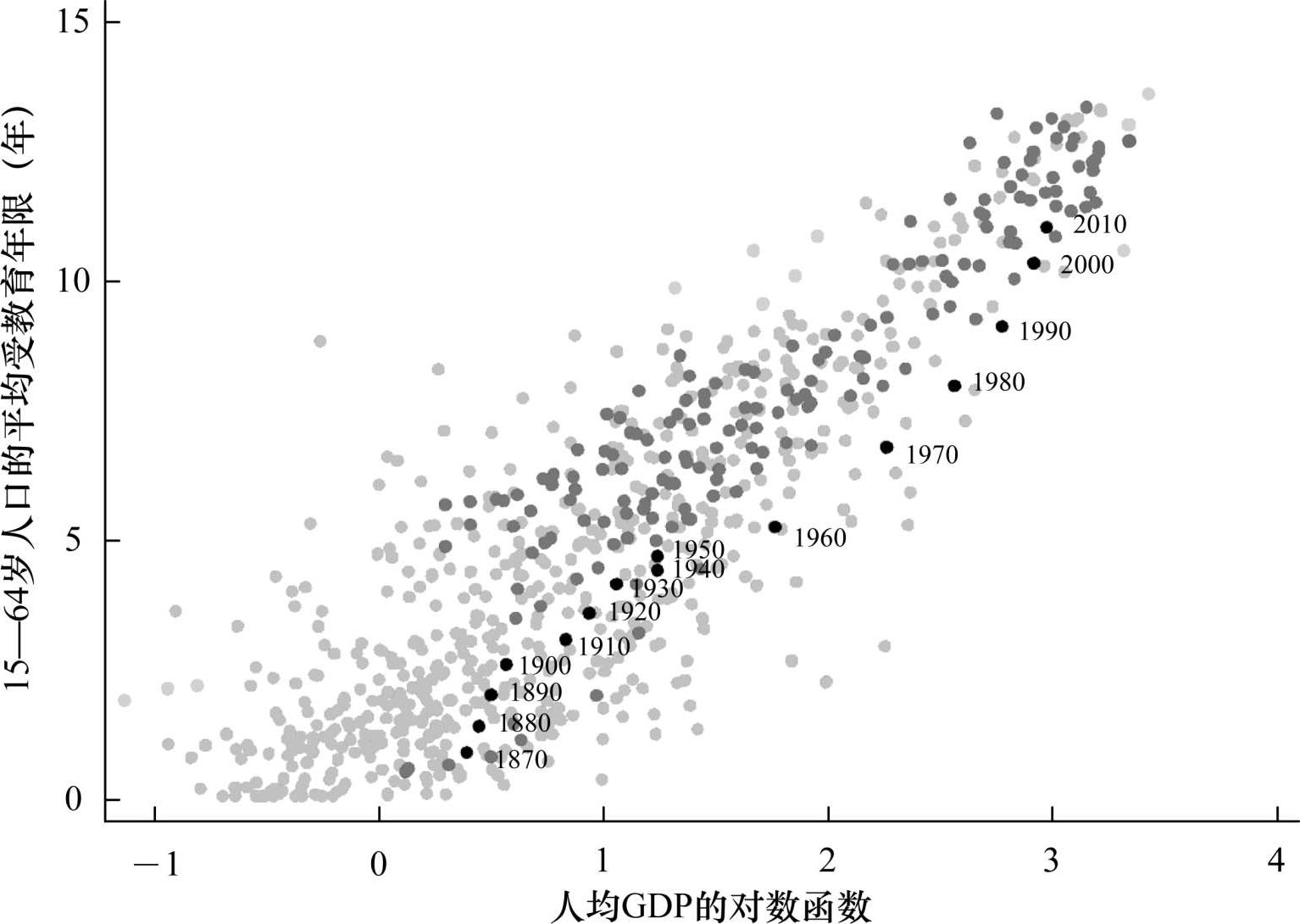 图1.1 平均受教育年限和人均GDP,1870—2010年