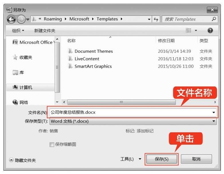 第4步 弹出【另存为】对话框,选择文档的保存位置,在【文件名】文本框中输入文档名称“公司年度总结报告”,单击【保存】按钮,如下图所示,即可完成创建公司年度总结报告文档的操作。