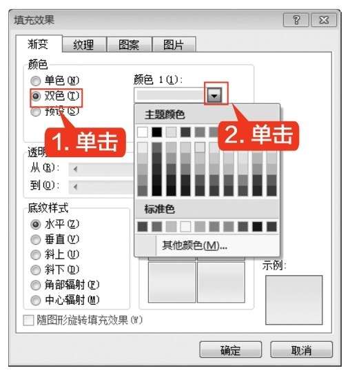 第2步 弹出【填充效果】对话框,选择【渐变】选项卡,在【颜色】栏中选中【双色】单选按钮,单击【颜色1】下拉列表框,在弹出的列表中选择一种颜色,如下图所示。