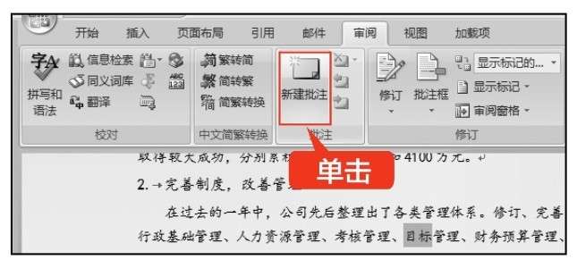 在文档中选择需要添加批注的文本,单击【审阅】选项卡下【批注】组中的【新建批注】按钮