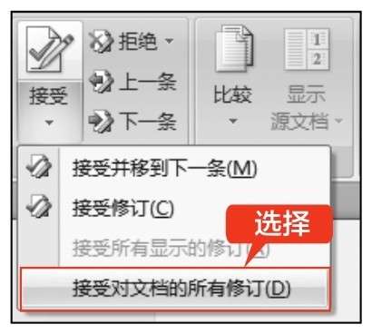 第4步 如果所有修订都是正确的,需要全部接受。单击【审阅】选项卡下【更改】组中【接受】按钮的下拉按钮,在弹出的下拉列表中选择【接受对文档的所有修订】选项即可,如下图所示。再次单击【审阅】选项卡下【修订】组中的【修订】按钮,结束修订状态。