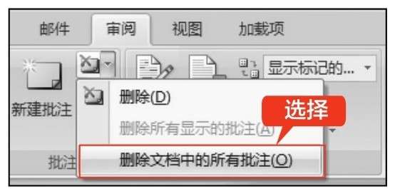 (2)选择要删除的批注,单击【审阅】选项卡下【批注】组中【删除】按钮的下拉按钮,在弹出的下拉列表中选择【删除文档中的所有批注】选项,如下图所示,即可删除所有批注。