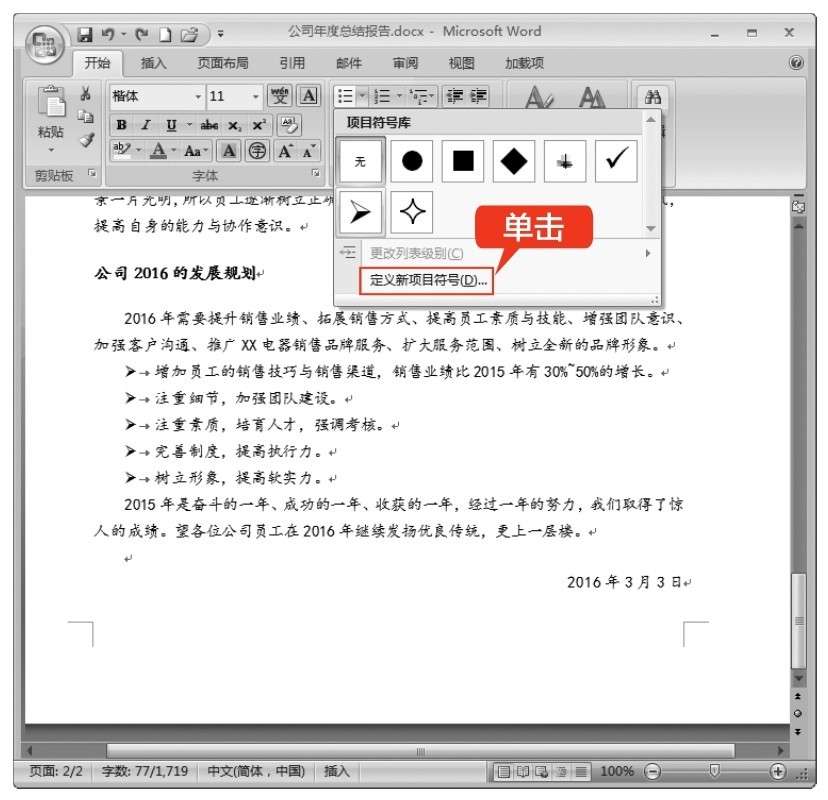 的下拉按钮,在弹出的【项目符号库】列表中选择一种样式,即可将选择的项目符号样式应用至所选的段落中。如果要自定义项目符号样式,可以单击【定义新项目符号】按钮,如下图所示。