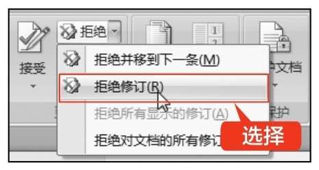 如果要拒绝修订,可以单击【审阅】选项卡下【更改】组中【拒绝】按钮