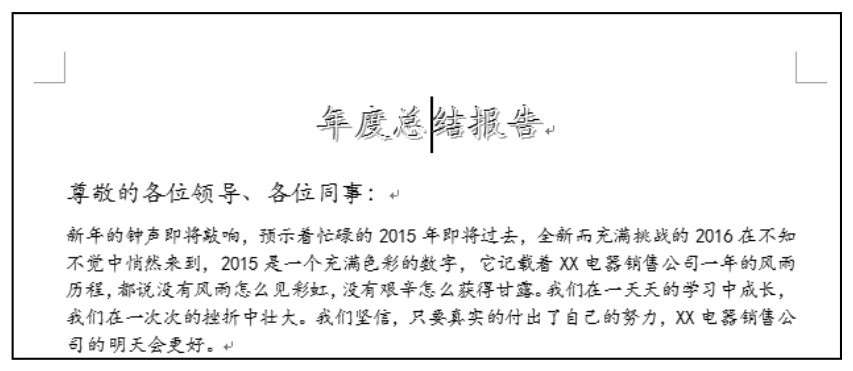 文本的输入非常简单,只要会使用键盘打字,就可以在文档的编辑区域输入文本内容。公司年度总结报告文档保存成功后,即可在文档中输入文本内容。