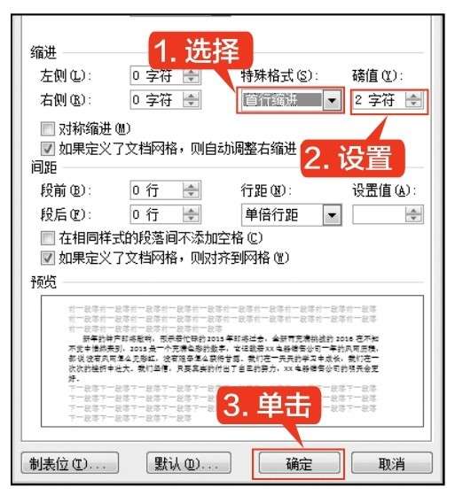 第2步 弹出【段落】对话框,单击【缩进】组中【特殊格式】文本框的下拉按钮,在弹出的下拉列表中选择【首行缩进】选项,并设置【磅值】为【2字符】(可以单击其后的微调按钮设置,也可以直接输入),然后单击【确定】按钮,如下图所示。