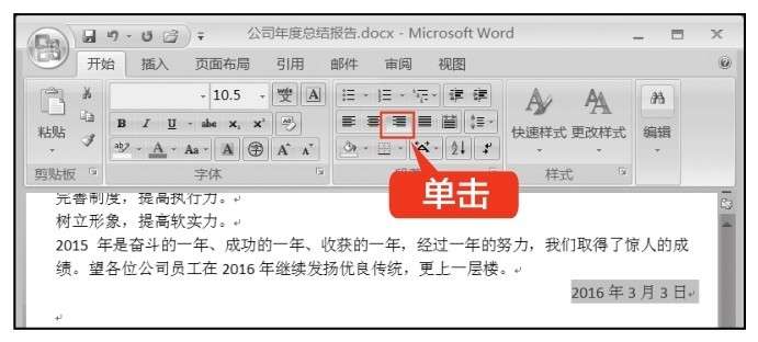 选择文档最后的日期文本,单击【开始】选项卡下【段落】组中的【右对齐】按钮