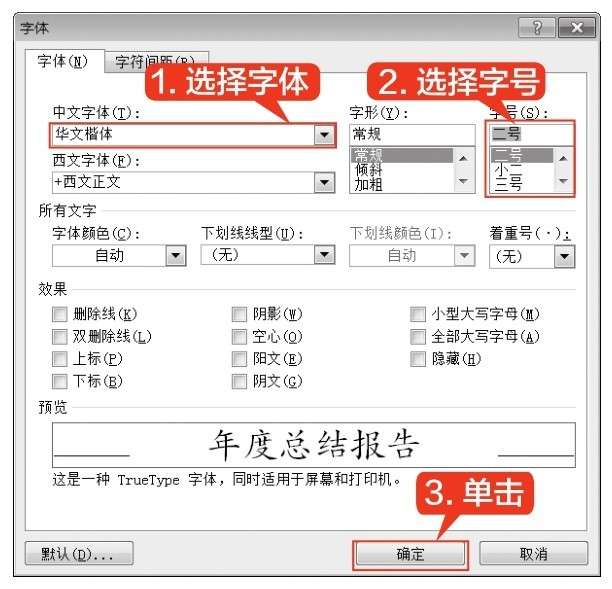 第2步 在弹出的【字体】对话框中选择【字体】选项卡,单击【中文字体】文本框后的下拉按钮,在弹出的下拉列表中选择【华文楷体】选项,选择【字号】列表框中的【二号】选项,单击【确定】按钮,如下图所示。