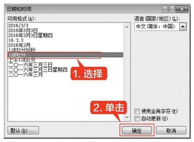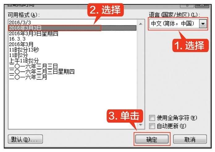 第2步 弹出【日期和时间】对话框,在【语言】选项下拉列表框中选择【中文】选项,在【可用格式】列表框中选择一种格式,单击【确定】按钮,如下图所示。